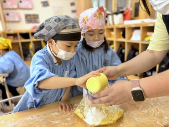 文字や数への興味・関心を様々な遊びや身近な環境に関わる中で、色々な不思議や面白いもの、面白い出来事に出会い、好奇心を感じて探求するようになります。なぜ?どうして?と言う思いから、調べたり、試したりする中で物事の規則性に気付き、物事について良く考える子どもを育みます。