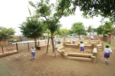 施設の特徴としては、木材を多用した温かみのある園舎と床暖房を備えた乳児保育室、比較的駅に近い立地の中でも広い園庭、芝生とシロツメ草に覆われた屋上園庭があげられます。加えて、隣接する「木かげ公園」も使うことができ、多様な遊びと体験ができる空間が広がっています。