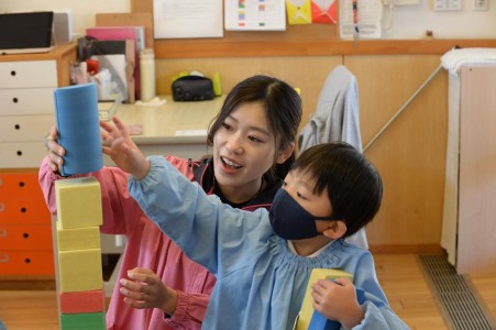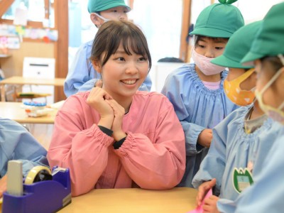 現在年少クラスの担任をしていますが、まずは、子どもたちにとってクラスが安心できる空間になることを大切に保育をしています。クラスは34人と多いですが1対1のかかわりを大切にコニュニケーションを取っています。