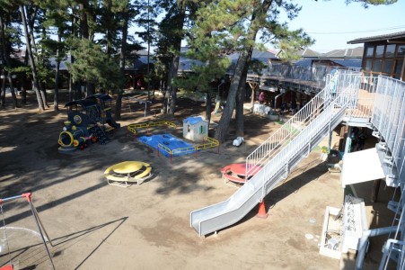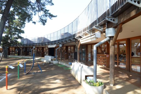 すみれ幼稚園は、園庭を囲むようにある教室から、日々子供たちの楽しそうな声が聞こえてきます。園舎の主だった特徴は、園舎全体のデザインが円形大規模木造建築であること、教室はすべて1階にあり外遊びを保障すると共に災害時、避難がスムーズであること、新たな遊びの空間としてラウンドバルコニーを設置していること、全面を天然芝生化したグランドがあることです。