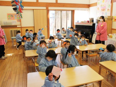 制服の脱ぎ着が目標だった年少さんの頃から月日が経ち、節分の時期に立派な鬼のお面を持ち帰ってくると「年長さんになって立派に成長したな。」と毎年感じます。引っ込み事案だった我が子が「自分はこういうところが得意なんだよ。」と自信が持てるようになったことも大きな成長です。子供の個性を見守って下さる園に感謝しています。